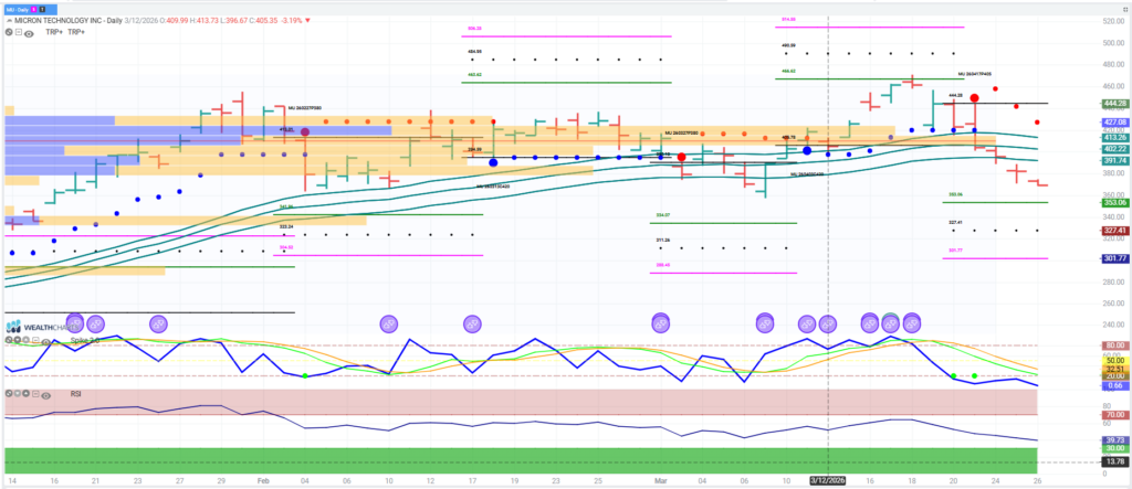 MU and memory names lower as GOOGL saying that there algo is 6x more efficient in memory usage or investors are derisking. MU option position indicates large positions at 350 and 370 which can act as support or acceleration below. Technically is approaching prior lows with reduced volume support until 340 which is the put wall. One can use 370 as the bull/bear level but now should look for bounces to be sold. It has been a darling and a good indicator for AI/tech enthusiasm as the revenue/earnings forecast has been positive.