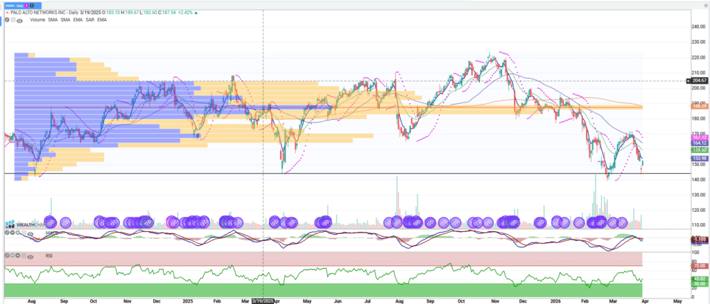 PANW and security stocks sold off for the second time with Claude latest release having security features which can make software more secure to hacking. Software in general is under distribution and PANW is an idea contrary to the trend. PANW has a large put position at 140 which may act as support and corresponds to prior lows. The CEO bought $2M of stock Fri and there are 350M of darkpool traded at 147.02 so potential for PANW to be a dead cat bounce idea, Put wall 150 is another level to watch with target 160-170. Could consider a short put spread as a way to trade a long with caveat that a move below 140 is an indication that PANW is taking the next step lower.